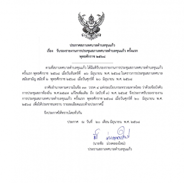 ประกาศสภาเทศบาลตำบลขุนแก้ว เรื่อง รับรองรายงานการประชุมสภาเทศบาลตำบลขุนแก้ว ครั้งแรก ประจำปี 2568