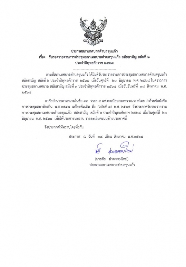 ประกาศสภาเทศบาลตำบลขุนแก้ว เรื่อง รับรองรายงานการประชุมสภาเทศบาลตำบลขุนแก้ว สมัยสามัญ สมัยที่ 2