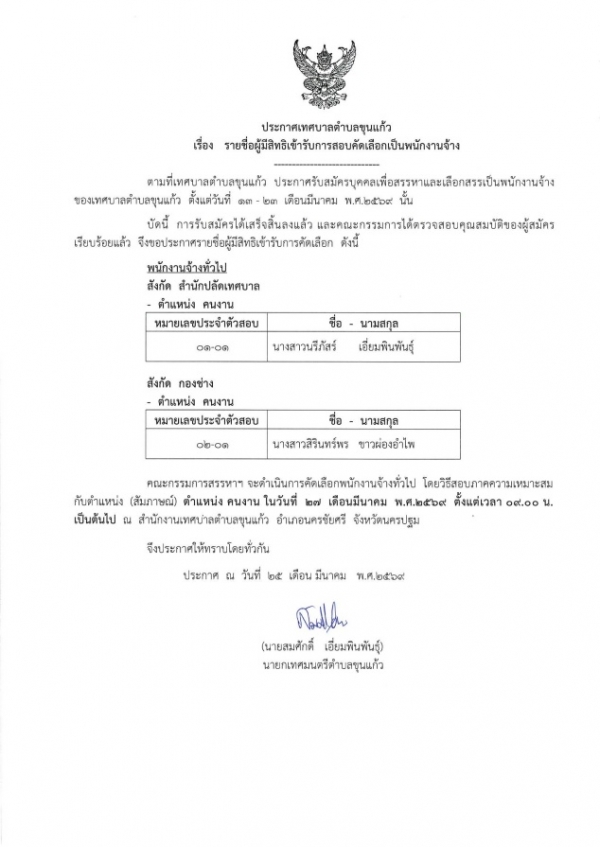 ประกาศเทศบาลตำบลขุนแก้ว เรื่อง รายชื่อผู้มีสิทธิเข้ารับการสอบคัดเลือกเป็นพนักงานจ้าง 25/03/69