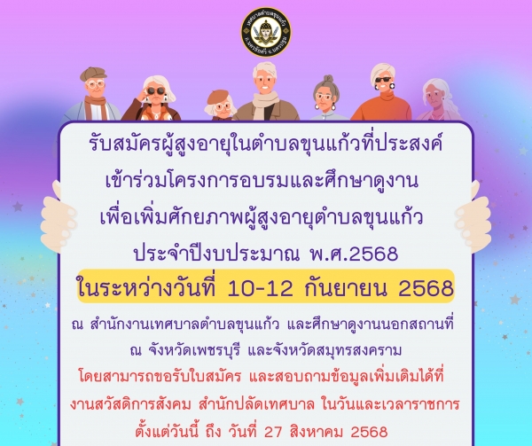 ด้วยเทศบาลตำบลขุนแก้ว ได้กำหนดจัดทำโครงการอบรมและศึกษาดูงานเพื่อพัฒนาศักยภาพผู้สูงอายุตำบลขุนแก้ว ประจำปี พ.ศ.2568 โดยมีวัตถุประสงค์เพื่อส่งเสริมสุขภาพกาย สุขภาพจิต และการเรียนรู้เพื่อเพิ่มศักยภาพของผู้สูงอายุตำบลขุนแก้ว ผู้สนใจและประสงค์จะเข้าร่วมโครงการ ต้องมีคุณสมบัติดังนี้