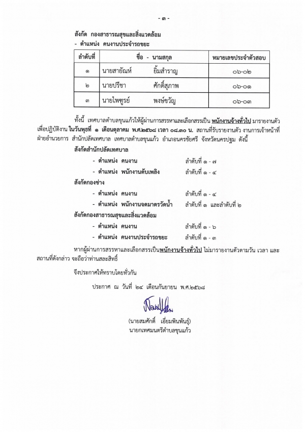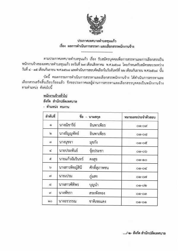 ประกาศเทศบาลตำบลขุนแก้ว เรื่อง ผลการดำเนินการสรรหา และเลือกสรรพนักงานจ้าง