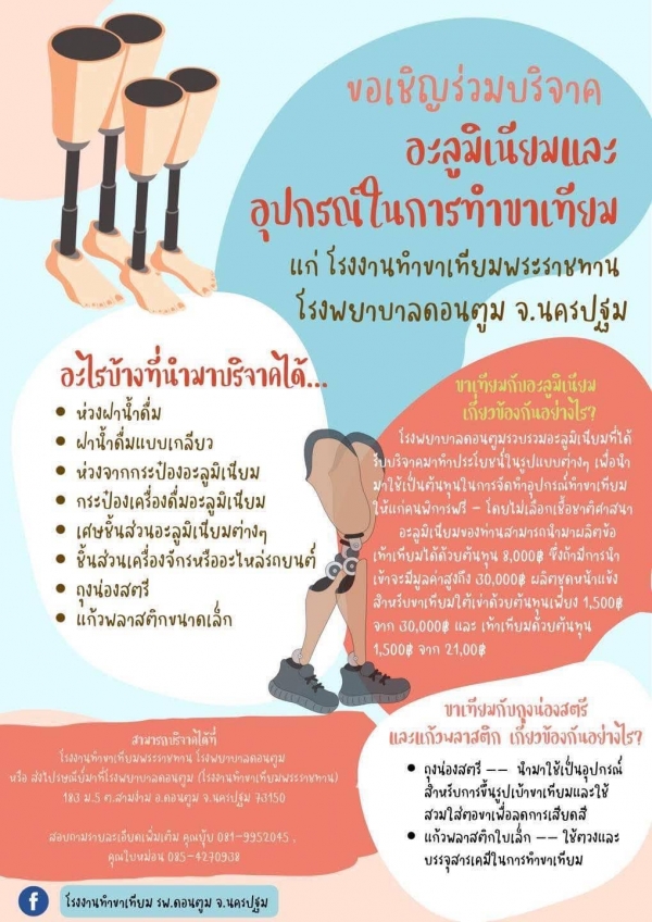 กองสาธารณสุขและสิ่งแวดล้อมรวบรวมอะลูมิเนียมจากประชาชนและสถานประกอบกิจการในพื้นที่ (บริษัท ดัชมิลล์ จำกัด) นำส่งให้โรงงานทำขาเทียมพระราชทาน