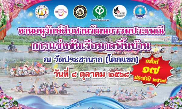 วัดประชานาถ (โคกแขก) ร่วมกับสมาคมท่องเที่ยวจังหวัดนครปฐม ขอเชิญชวนประชาชนในพื้นที่และนักท่องเที่ยวทุกท่าน ร่วมงานอนุรักษ์สืบสานวัฒนธรรมประเพณี การแข่งขันเรือมาดพื้นบ้าน ครั้งที่ 17 ประจำปี 2568 ในวันพุธที่ 8 ตุลาคม 2568 ณ วัดประชานาถ (โคกแขก) ตำบลขุนแก้ว อำเภอนครชัยศรี จังหวัดนครปฐม