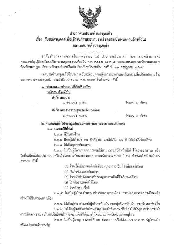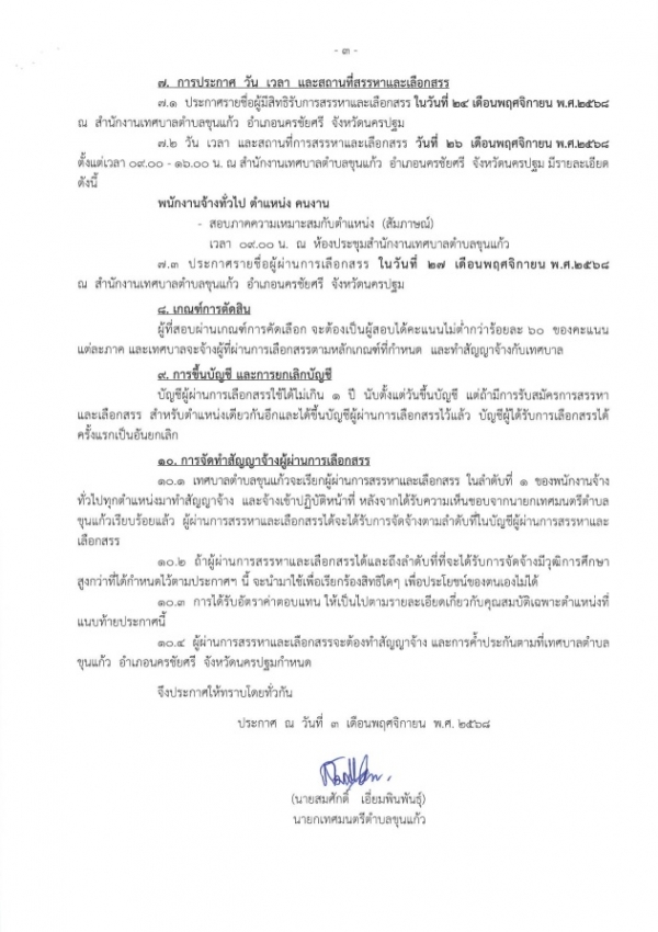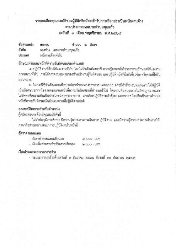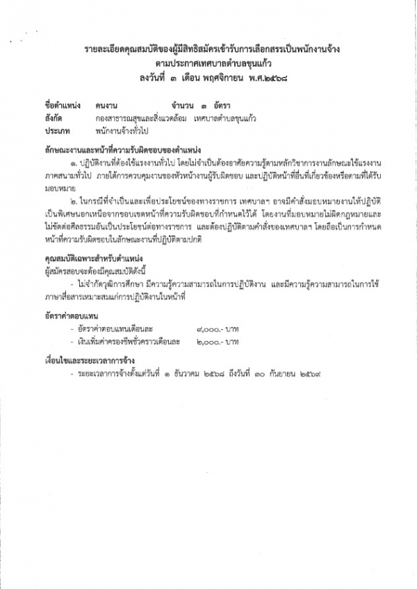 ประกาศเทศบาลตำบลขุนแก้ว เรื่อง รับสมัครบุคคลเพื่อเข้ารับการสรรหาและเลือกสรรเป็นพนักงานจ้างทั่วไปของเทศฐาลตำบลขุนแก้ว 3/11/68
