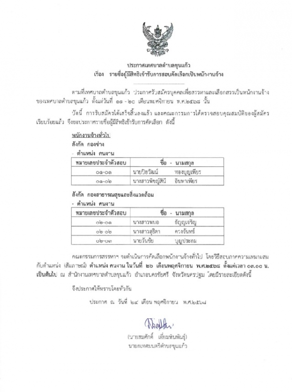 ประกาศเทศบาลตำบลขุนแก้ว เรื่อง รายชื่อผู้มีสิทธิเข้ารับการสอบคัดเลือกเป็นพนักงานจ้าง 24/11/68